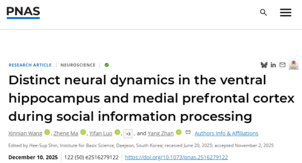 12月10日,中国科学院深圳先进技术研究院脑认知与脑疾病研究所/深港脑科学创新研究院詹阳研究员团队在PNAS杂志上发表了题为"Distinct neural dynamics in the ventral hippocampus and medial prefrontal cortex during social information processing"的研究论文。该研究整合在体多通道电生理记录、信息论方法与神经解码分析等多种技术手段,揭示了vHPC与mPFC在社交信息处理中具有不同的神经振荡特性与群体编码机制,并进一步提示mPFC在社交信息表征中具有更强的编码能力。