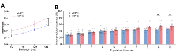 为量化神经群体对社交刺激的信息编码能力,研究团队采用了香农信息熵分析。结果发现,mPFC所编码的信息量显著优于vHPC。基于机器学习的分类解码分析进一步表明,随着纳入分析的神经元数量增加,mPFC的解码准确率始终高于vHPC。信息熵与贝叶斯解码分析共同证实,mPFC在表征不同社交个体时具备更高的信息含量与解码准确性。