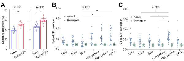 研究中,团队记录了自由活动小鼠在三箱社交互动范式中vHPC与mPFC中的神经元放电活动(spike)和局部场电位(local field potential, LFP)。单神经元放电频率分析与群体解码结果显示,尽管在vHPC与mPFC中均存在对不同社交刺激表现出增强或抑制反应的神经元响应群体,但两个脑区的神经元响应比例是有差异的,且mPFC神经元表现出更广泛的选择性。研究还进一步分析了兴奋性和抑制性神经元对不同社交刺激的反应模式。