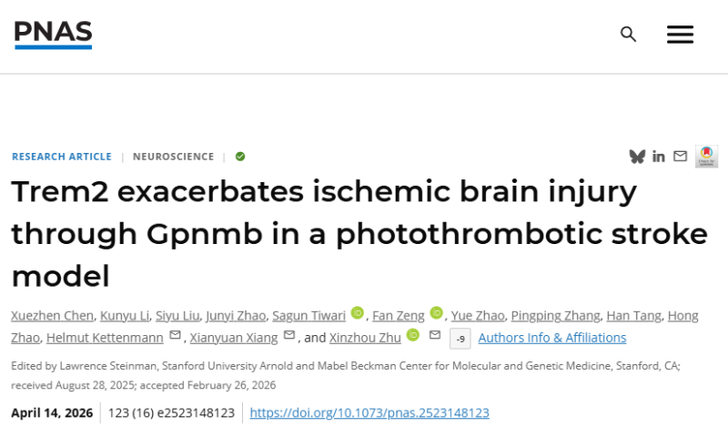 4月14日,中国科学院深圳先进技术研究院脑认知与脑疾病研究所/深港脑科学创新研究院祝心舟团队,联合深圳理工大学生命健康学院Helmut Kettenmann/项贤媛团队在国际期刊PNAS在线发表了一项题为“Trem2 exacerbates ischemic brain injury through Gpnmb in a photothrombotic stroke model”的研究论文。该研究揭示了Trem2在缺血性脑卒中后通过调控小胶质细胞介导神经炎症,进而加剧脑损伤的新机制,为理解卒中病理过程及临床转化提供了重要的新视角。