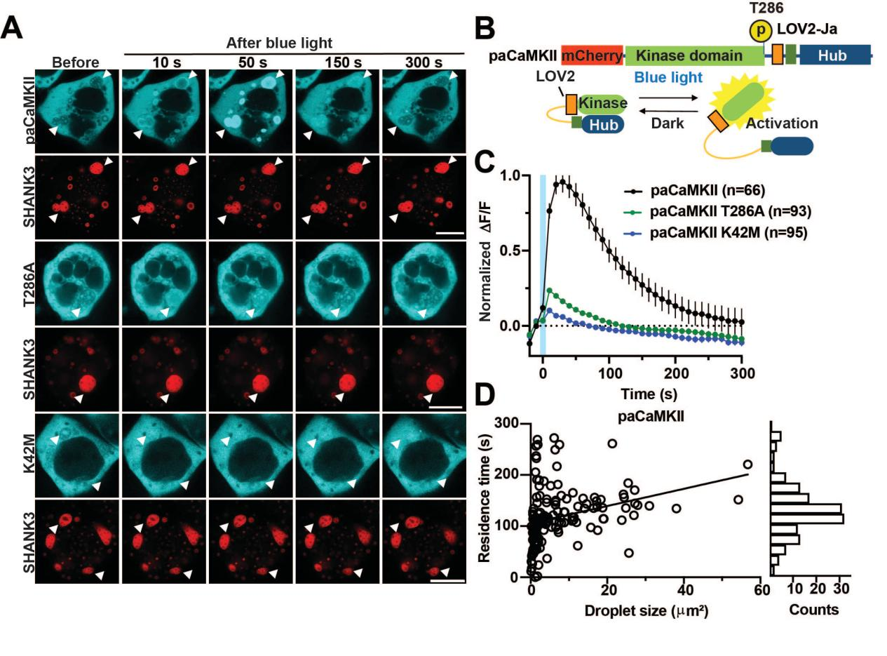 图3. 光调控CaMKII显示SHANK3凝聚体快速招募激活后的CaMKII